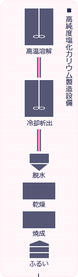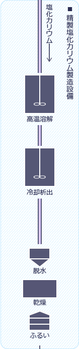 脱水機から取りだされた塩化カリウム(純度95%)は、高温溶解され再度結晶化、脱水、乾燥される事で純度の高い塩化カリウム(純度99%)が製造されます。