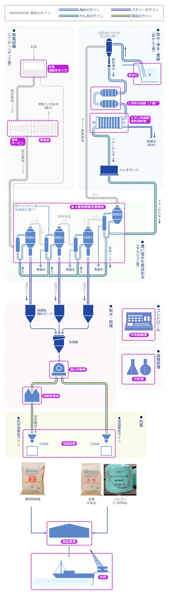 タービンから出た低圧蒸気は「真空式多重効用缶」へ送り、電気透析槽で生成した「かん水」を蒸発させて塩の結晶をつくります。